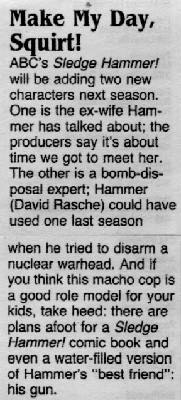 ABC's Sledge Hammer! wwill be adding two new characters next season. One is the ex-wife Hammer has talked about; the producers say it's about time we got to meet her. The other is a bomb-disposal expert; Hammer (David Rasche) could have used one last season when he tried to disarm a nuclear warhead [The Spa Who Loved Me]. And if you think this macho cop is a good role model for your kids, take heed: there are plans afoot for a Sledge Hammer! comic book and even a water-filled version of Hammer's "best friend": his gun.