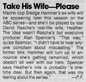 Macho cop Sledge Hammer's ex-wife will be appearing later this season on the ABC series [Here's To You, Mrs. Hammer]-- and she'll be played by star David Rasche's real-life wife, Heather. The idea wasn't Rasche's but executive producer Alan Spencer's. "That way," quips Spencer, "I didn't have to hear anyone complain about miscasting." The former Mrs. Hammer will turn up to announce she's getting remarried, which doesn't sit well with our hero. Spencer says Heather's role is probably "a one-time deal. But then again, that was my feeling about the series." -- P.F.