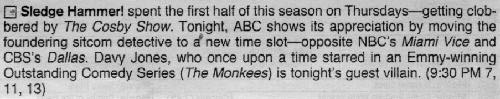 Sledge Hammer! spent the first half of this season on Thursdays -- getting clobbered by The Cosby Show. Tonight [Sledge, Rattle, 'N' Roll], ABC shows its appreciation by moving the foundering sitcom detective to at new time slot -- opposite NBC's Miami Vice and CBS's Dallas. Davy Jones, who once upon a time starred in an Emmy-winning Outstanding Comedy Series (The Monkees) is tonight's guest villain. (9:30 PM 7, 11, 13)