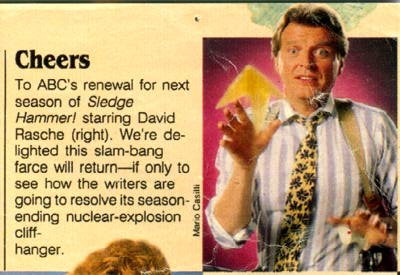 To ABC's renewal for next season of Sledge Hammer! starring David Rasche (right). We're delighted this slam-bang farce will return -- if only to see how the writers are going to resolve its season-eding nuclear-explosion cliffhanger [The Spa Who Loved Me].