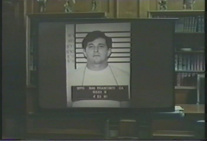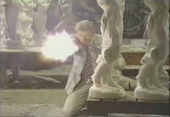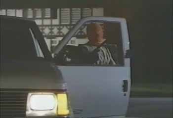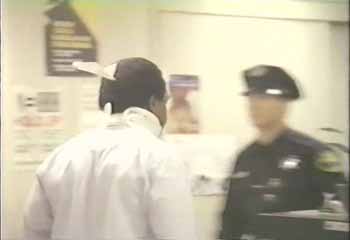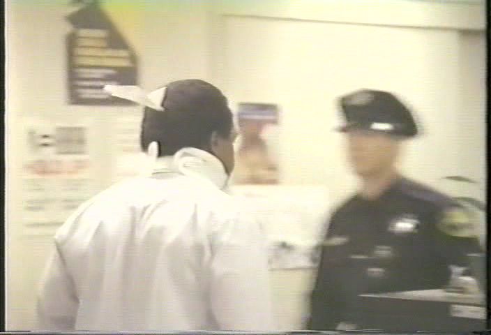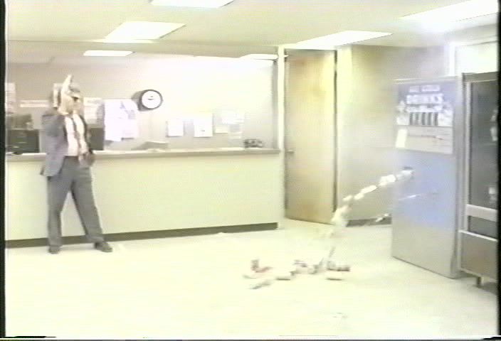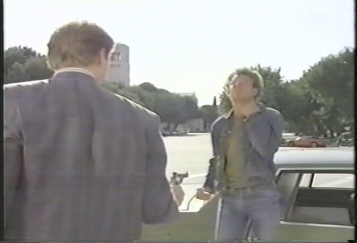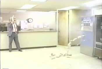 When Hammer enters the police station, other employees are running for cover. The one remaining person is standing by a vending machine that has just taken his money. After Hammer offers to help him out, he too takes shelter. [gunshots 7 and 8] Cans and coins then stream out of the machine.