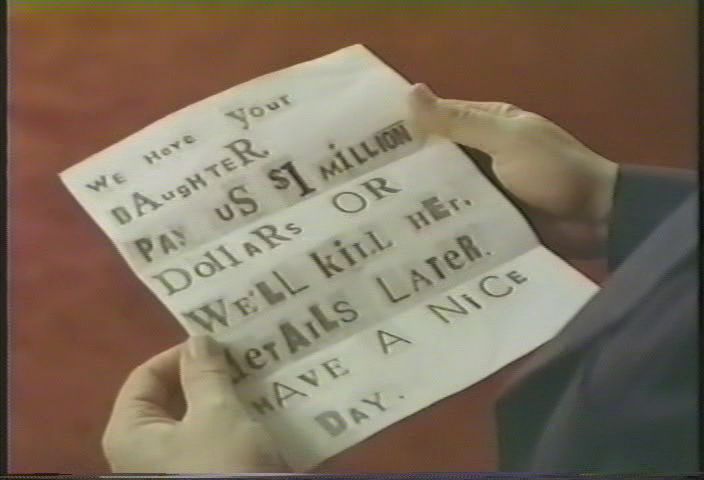 Mayor: (reading the note) "We have your daughter. Pay us one million dollars or we'll kill her. Details later. Have a nice day." One million dollars. Good lord!