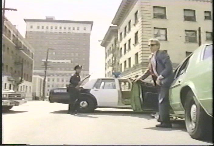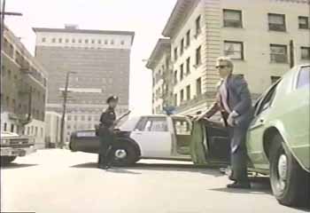 Even as a police car window shatters and a tire deflates from the sniper's shots, Hammer confidently walks towards the building.