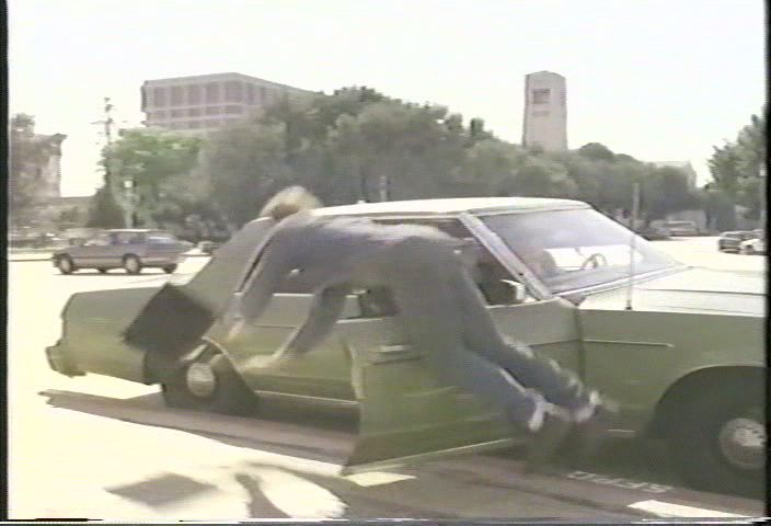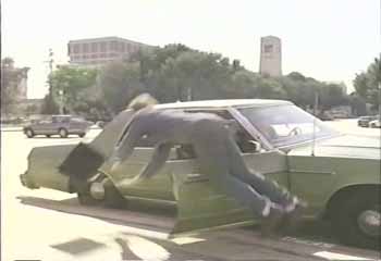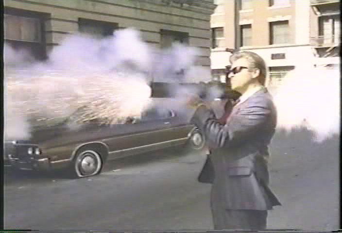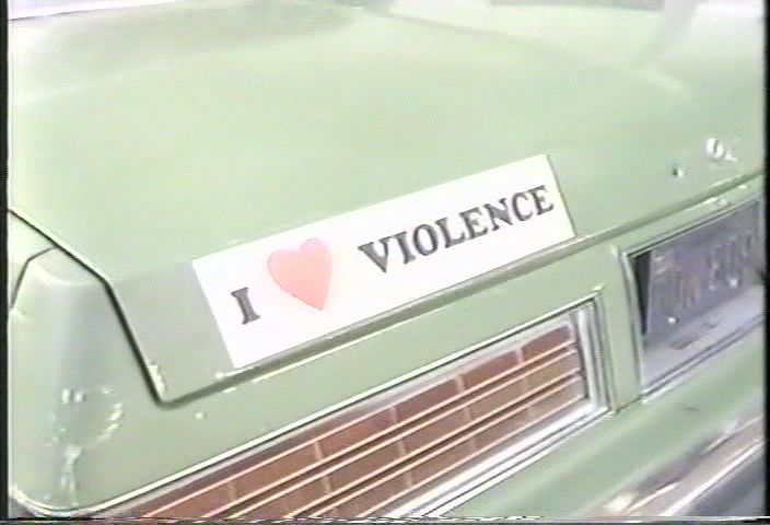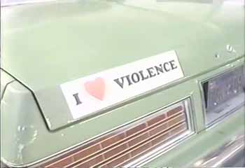 As the sniper continues to rain down shots, Hammer goes back to his car and pulls a bazooka (shoulder-held rocket launcher) out of his trunk. His bumper sticker reads, "I [heart symbol] VIOLENCE".